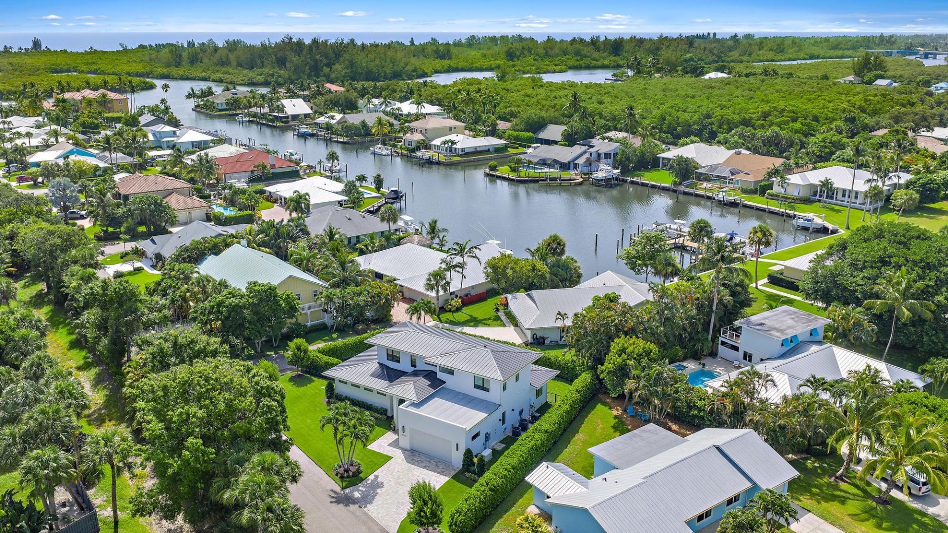 Located in the canal community of The Harbour at Hobe Sound this custom contemporary residence w/water-views completed in late Oct 2023 blends modern luxury w/ coastal living & potential for a leased boat slip. The 4BR plus office home is pristine & move-in ready. Lush landscaping creates privacy w/ water access steps away. The open floor plan features a spacious family room & chef's kitchen w/ custom cabinetry, Kesseb?hmer pull-outs & premium Bosch, Bertazzoni & XO appliances. High-end finishes include impact glass windows, quartz countertops, custom closets & built-ins, metal roof, whole-house generator & water filtration system. Outdoor living includes a heated saltwater pool, travertine deck, outdoor shower & covered lanai w/ TV & sound system perfect for enjoying the Florida lifestyle