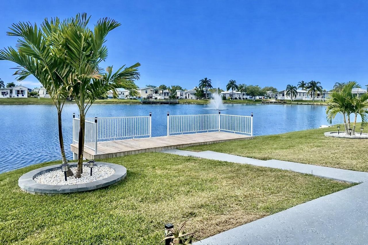 Welcome to Oasis Village 55+Community!This stunning 2 bed and 2 bath furnished home on the lake has a new dock and is completely renovated. It is move-in ready! A new metal roof, A/C unit, water heater, vinyl siding and all of the interior have all been replaced in the past 5 years. The new paver addition offers extra parking, or room for a boat. Inside this beauty, you will feel safe with impact windows that have been solar-tinted for maximum electric efficiency! New luxury vinyl plank flooring and trim package throughout. Kitchen has matching SS appliances and soft-close wood cabinets. Both bathrooms have been fully updated. The home has new doors, lights and ceiling fans. You can enjoy the fully screened, enclosed sunroom and slide open the windows for the natural air. Turn on the electric fireplace for warmth, or relax in the back room taking in the gorgeous sunsets over the lake! Go on the dock to feed the local turtles. This home is a true Oasis! You can take part in the community amenities, including heated swimming pool, pickle ball courts, shuffleboard and the many activities in the big clubhouse. Trash, pest control for yard and lawn mowing included in low HOA fee. This gem of a community is conveniently located close to shopping.
