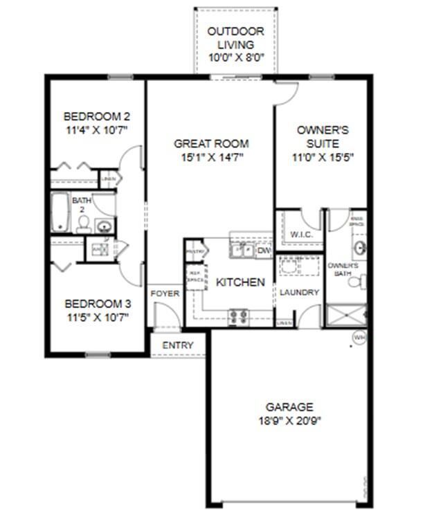 Welcome to the Pindo floorplan, an offering from our Value collection. Step inside and experience the open and airy ambiance created by the long view from the front door to the sliding glass doors at the back of the home. Natural light floods the space, providing a refreshing atmosphere. This thoughtfully designed home features two bedrooms and a bathroom on one side, offering comfort and convenience. On the other side, you'll find the private and spacious Owners Suite, ensuring a tranquil retreat. The open kitchen boasts a breakfast bar and generous countertops, perfect for meal preparation and entertaining